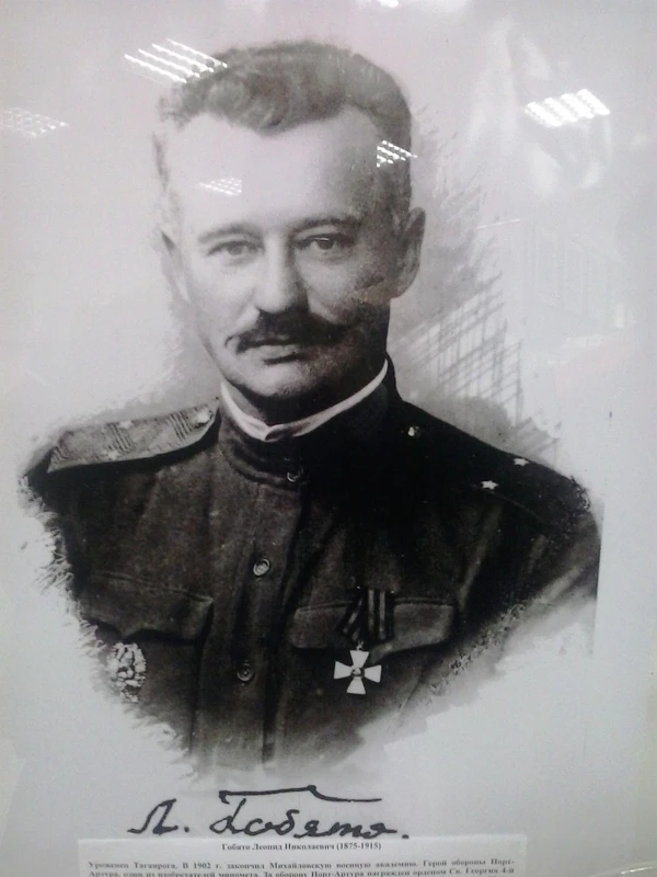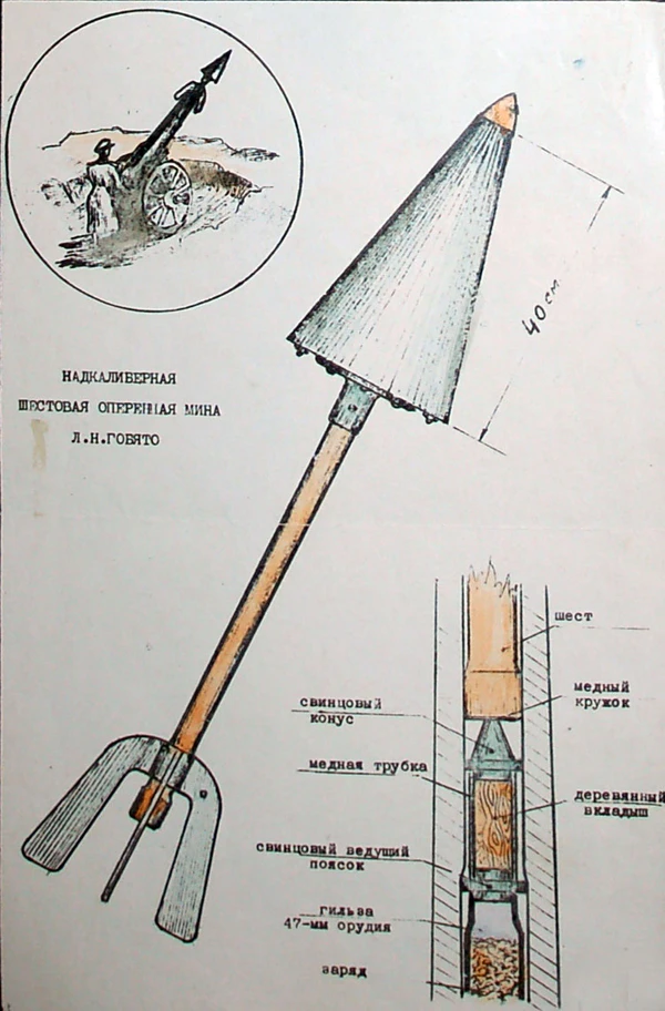 В ходе боевых действий выявилась необходимость применения навесного огня для поражения живой силы и огневых средств японцев в близко расположенных траншеях, лощинах, оврагах. Мичман С. Н. Власьев предложил использовать с этой целью мину для стрельбы из 47-мм мортирной пушки. Л. Н. Гобято возглавил работы по созданию «минных мортир», изобрёл надкалиберную мину со стабилизатором, в качестве метательных аппаратов для которой использовались стволы 47-мм морских орудий, установленных на колёсных лафетах, или металлические трубы, крепившиеся к деревянным колодам[Комм 1].