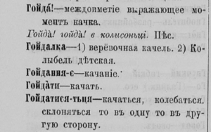- «междометие, выражающее момент качка» (от глагола «гойда́ти» — качать), согласно «Словарю живого народного, письменного и актового языка русских южан Российской и Австро-Венгерской империи»[7]. В словаре Даля также есть слово «гойдать», означающее «качели, колыбель, южн. зап. качать, колыхать, раскачивать. -ся, качаться на качелях. Гойдалка ж. качели»[8].