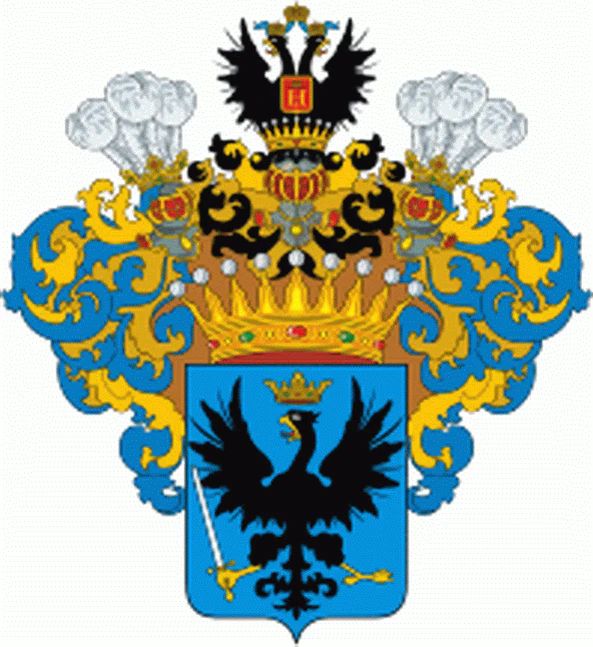 Щит увенчан графской короной и тремя графскими шлемами. Нашлемники: средний — возникающий императорский орёл, имеющий на груди чермный с золотой каймой щит с таким же вензельным изображением имени Императора Николая I; второй и третий — три серебряных страусовых пера. Намёт средний — чёрный с золотом, иные — лазурные с золотом[13].