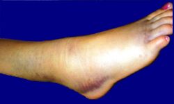 При растяжении связок голеностопного сустава быстро развивается отек вследствие кровоизлияния с внутренней или наружной стороны сустава, появляются резкие боли при подвертывании стопы внутрь. При пальпации под лодыжками ощущается резкая болезненность. Если одновременно с растяжением связок происходит перелом V плюсневой кости, то определяется резкая боль при пальпации её основания.