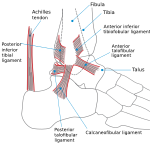 - На внешней стороне сустава расположены передняя и задняя таранно-малоберцовые и пяточно-малоберцовая связки — все они расходятся веерообразно, начинаясь на латеральной лодыжке: передняя таранно-малоберцовая связка (лат. ligaméntum talofibuláre antérius) крепится к шейке таранной кости, задняя таранно-малоберцовая связка (лат. ligaméntum talofibuláre postérius) — к заднему отростку таранной кости, а пяточно-малоберцовая связка (лат. ligaméntum calcaneofibuláre) спускается вниз, оканчиваясь на наружной поверхности пяточной кости.