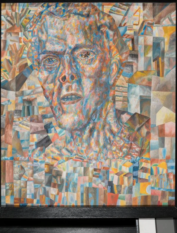 Картина представляет собой портрет человека, изображённого по плечи в лёгком повороте влево. Лицо передано с акцентом на мимику: рот приоткрыт, видны зубы, ноздри обращены к зрителю. Изображение выполнено в технике мозаичной живописи с использованием мелких мазков синих, розовых, жёлтых и зелёных оттенков.