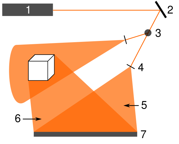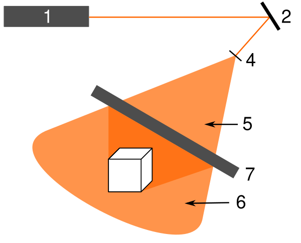 Лейт и Упатниекс отказались от осевой технологии записи голограмм, использованной Габором в 1948 году из-за ряда её недостатков. Они разработали так называемую «неосевую схему», направив опорную волну под углом и разделив свет на две части, попадающие на фотопластинку разными путями[34]. Луч лазера 1 делится призмой 3 с полупрозрачной гранью на два потока: опорный и объектный[35]. Полученные лучи с помощью рассеивающих линз 4 расширяются и направляются на объект и регистрирующую среду (например, фотопластинку). Отражённый от регистрируемого объекта свет 6 объектной волны падает на пластинку 7 с той же стороны, что и опорная волна 5[36]. В результате на поверхности фотоэмульсии формируется неподвижная картина интерференции отражённого от объекта света с опорной волной[37].