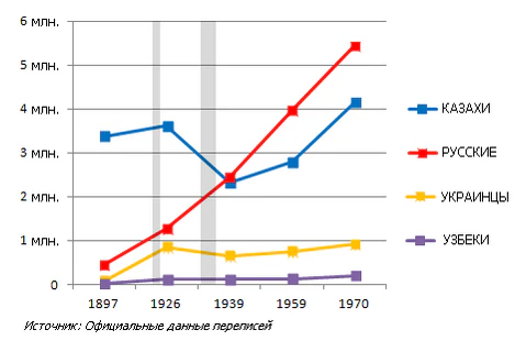 Казахи только к 1970 г. восстановили внутри Казахстана свою численность на уровне 1926 г[24]. До голода в Казахстане в 1932—1933-х годах в Казахстане в этническом отношении доминировали казахи, но только к концу 1990-х они снова стали большинством в республике (хотя данные переписи 1939 года указывали казахов как большинство в Казахской ССР). На освободившиеся места в период 1938-44 гг. советскими властями были переселены ссыльные и депортированные народы: ингуши, чеченцы, крымские татары, корейцы, балкарцы, курды, турки, карачаевцы, поляки, немцы[25]. Также население Казахстана пополнилось узниками ГУЛАГа: Карлага, Степлага, Песчанлага и др., часть которых остались жить впоследствии в Казахстане.