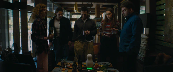 Колонка «Алёна», которая знает обо всех «скелетах» участников процесса, выступает в качестве провокатора, выполняя важную функцию в линии детективного построения сценария. Она ведёт свое «интерактивное расследование», каждый раз вскрывая всё новые и новые тайны и обиды, человеческие слабости, постоянно демонстрируя сценарные твисты, благодаря которым сюжет держит зрителя в напряжении, примеряя роль «убийцы» на каждого из героев. А ещё это хорошая попытка поразмыслить зрителю о том, куда может привести неконтролируемое развитие ИИ[27].