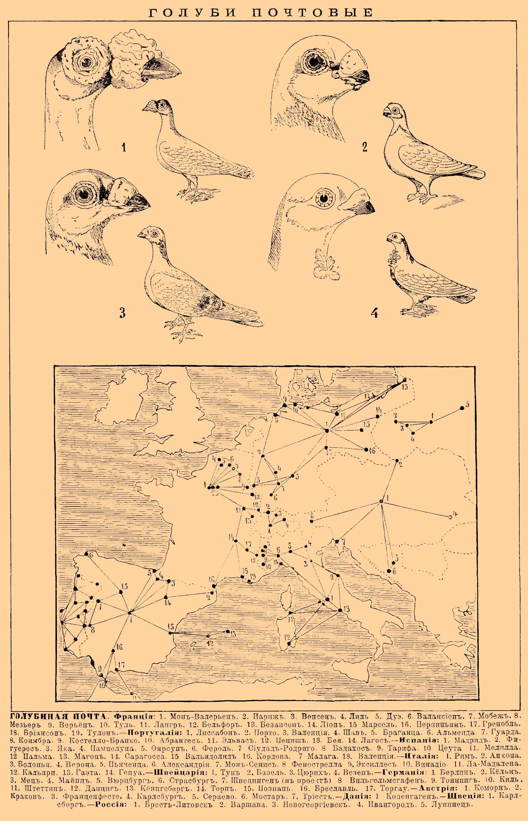 К концу XIX века почти во всех европейских государствах пользовались голубями для военных целей, для чего содержали особые военные голубятни в крепостях и городах. В большинстве европейских государств частные общества были обязаны в случае войны передавать своих голубей в руки военного ведомства. Таблица и рисунок ниже показывают сеть почтово-голубиных сообщений, организованных в Европе на военное время (сообщаемые сведения относятся к 1891 году)[2]: