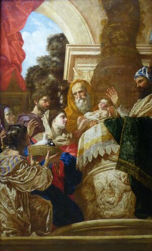 Голуби встречаются и в христианских изображениях, связанных с темой жертвоприношения во Храме — Изгнание торгующих из Храма и Принесение во Храм (Сретение)[10]. В первой из упомянутых сцен Христос изгоняет менял, торговцев волами, овцами и голубями, которые сбегают, хватая свой товар. Животные здесь продавались как священные: овцы и волы для богатых, голуби для бедных, желающих принести жертву[13]. В сцене Принесения во храм жертва Иосифа Обручника именно в виде голубей является свидетельством его бедности[13]. В книге Левита (12:8) об обряде «очищения» матери первенца, требовавшего жертвоприношения, написано соответствующее: «Если же она не в состоянии принести агнца, то пусть возьмет двух горлиц или двух молодых голубей, одного во всесожжение, а другого в жертву за грех, и очистит её священник, и она будет чиста». Жертва в данном случае требовалась согласно Моисееву закону, требовавшему, чтобы первенец всего живого был посвящен Богу — за ребёнка приносили поэтому выкуп в 5 сиклей (Чис., 18:15-17)[14]. На картинах, посвященных Сретению, взрослые персонажи могут держать пару голубей в качестве указания на тему очищения[14].