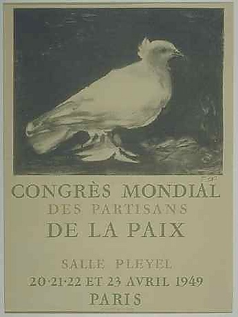 «Арагон забрал рисунок в полдень, а уже в пять часов вечера по всему Парижу были развешаны афиши с изображением голубки. (…) Возможно, Пикассо и сам не предполагал, какой силой обладает его „Голубка“, пока не увидел её увеличенное изображение в зале Плейель, где проходил Конгресс. Она парила над залом в свете прожекторов, над толпой восторженных, объединённых одной надеждой людей»[11].
