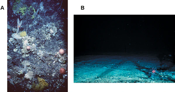 Глубоководный голубой углерод находится в открытом море за пределами национальной юрисдикции[11]. Он включает углерод, содержащийся в «водах континентального шельфа, глубоководных водах и морском дне под ними» и составляет 90 % всего океанического углерода[12]. Тёмно-синий углерод обычно рассматривается как «менее поддающийся управлению» и сложный из-за отсутствия данных, «касающихся постоянства их запасов углерода»[3].