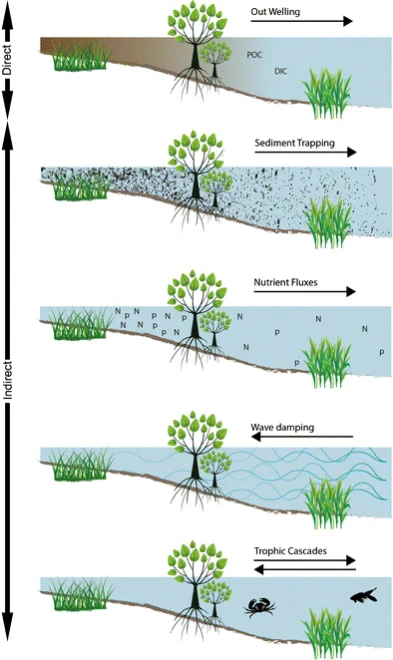 Мангровые заросли, как и морские водоросли, обладают потенциалом для высокого уровня секвестрации углерода. На их долю приходится 3 % глобального поглощения углерода тропическими лесами и 14 % захоронения углерода в прибрежных районах Мирового океана.[33]