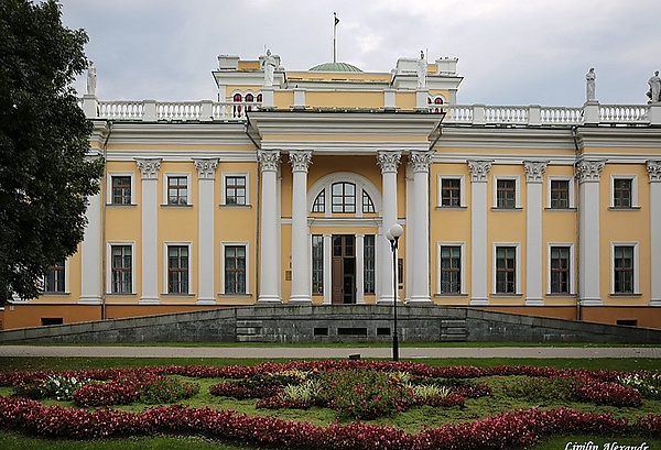 Композиционным центром ансамбля является построенный в стиле классицизма дворец. Предполагаемым автором первоначального проекта (1777—1794) является архитектор Иван Старов[26]. В дальнейшем над ансамблем работали архитекторы Джон Кларк, возводивший Петропавловский собор (1809—1824)[27], и Адам Идзковский, осуществивший перестройку дворца и разбивку парка при И. Ф. Паскевиче[28]. Часовня-усыпальница семьи Паскевич была создана в русском стиле в 1889 году по проекту архитектора Е. И. Червинского.