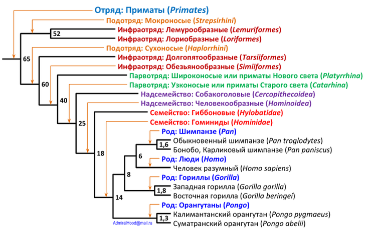 Филогенетическое дерево (хронограмма) гоминид и его положение в филогенетическом дереве приматов. Семь ныне существующих видов гоминид обозначены чёрным шрифтом. Различными цветами показаны более крупные ветви дерева приматов. Цифры показывают ориентировочное время расхождения филогенетических групп (млн лет назад) по данным молекулярной филогенетики (http://www.onezoom.org/, данные на 07.09.2017)