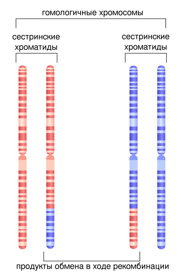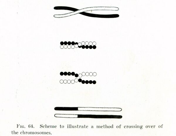 В начале 1900-х годов Уильям Бейтсон и Реджинальд Паннет нашли исключение из одного из законов Менделя, первоначально описанных Грегором Менделем в 1860-х годах. В отличие от идеи Менделя о том, что признаки наследуются независимо друг от друга при передаче их потомству, Бейтсон и Паннет показали, что некоторые гены, связанные с физическими признаками, могут быть унаследованы вместе, или генетически связаны[9][10]. В 1911 году, когда выяснилось, что связанные черты могут иногда передаваться отдельно, Томас Хант Морган предположил, что между связанными генами происходит кроссинговер[11], во время которого один из сцепленных генов физически переходит на другую хромосому. Двадцать лет спустя Барбара Мак-Клинток и Харриет Крейтон доказали, что обмен участками хромосом происходит при мейозе[12][13], обычно связанном с образованием гамет. В тот же год, когда было совершено открытие Мак-Клинток, Курт Штерн показал, что кроссинговер может также происходить в соматических клетках, таких как лейкоциты и клетки кожи, которые делятся митозом[12][14].