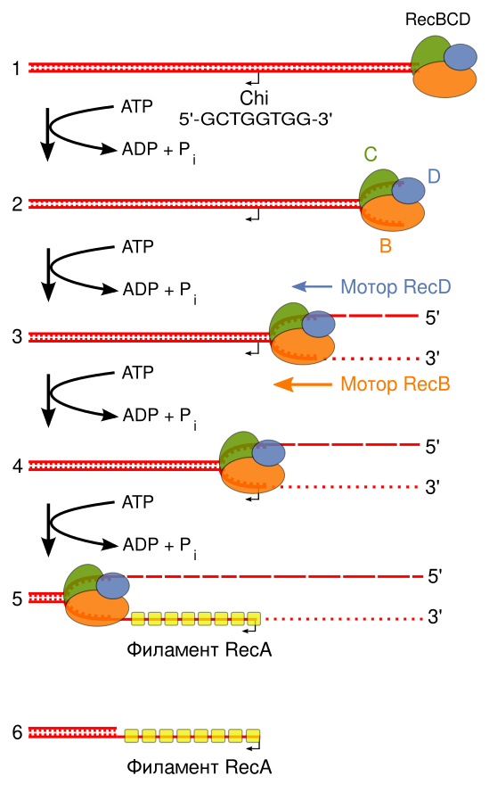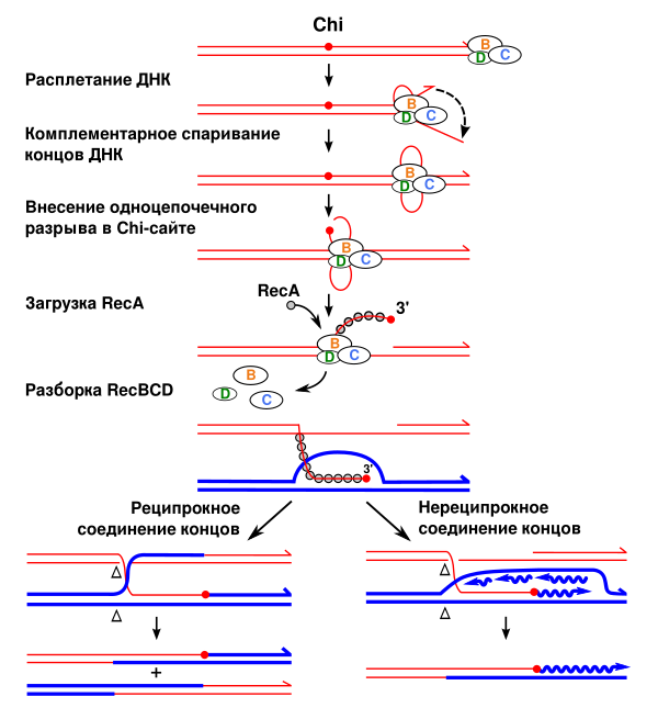 Столкновение с Chi-сайтом резко меняет активность фермента RecBCD[53][48][56]. Раскручивание цепи замирает на несколько секунд, а затем возобновляется со скоростью, примерно вполовину меньшей, чем вначале. Вероятно, это связано с тем, что после Chi-сайта ДНК расплетает хеликаза RecB — более медленная, чем RecD, которая расплетает ДНК до Chi-сайта[57][58]. Распознавание Chi-сайта приводит к тому, что RecBCD вносит разрыв в цепь, содержащую Chi-сайт, и начинает загружать белки RecA на новообразованный 3'-конец. Получившаяся нуклеопротеидная нить ищет похожую последовательность ДНК на гомологичной хромосоме и внедряется в неё. Процесс поиска вызывает растяжение ДНК-дуплекса, что усиливает гомологическую распознаваемость (механизм, называемый конформационным считыванием (англ. Conformational proofreading))[59][60][61]. Внедрение нуклеопротеидной нити вытесняет одну из цепей дуплекса гомологичной хромосомы и формируется D-петля, дальнейший разрез которой приведет к появлению структуры Холлидея[54]. Если две взаимодействующие молекулы различаются, то разрешение структуры при помощи белков RuvABC- или RecG создает две рекомбинантные молекулы ДНК разных генетических типов (реципрокный механизм). Однако возможен и альтернативный ход развития событий: внедрение 3'-нуклеопротеидной цепи с Chi-сайтом на конце может спровоцировать синтез ДНК и образование репликативнной вилки, но в итоге образуется только один тип рекомбинантной ДНК (нереципрокный механизм)[48].