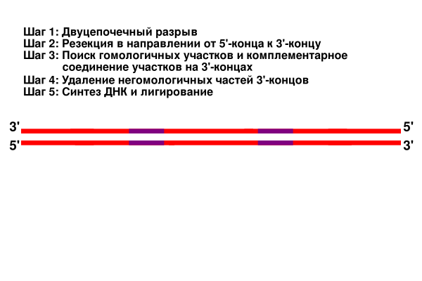 Известно два основных механизма гомологичной рекомбинации: путь репарации двуцепочечных разрывов (DSBR-путь), также известный как модель двойной структуры Холлидея, и путь синтезозависимого отжига цепи (SDSA-путь)[33]. Оба начинаются одинаковым образом. Когда двуцепочечный разрыв в цепи обнаружен, белковый комплекс MRX (у человека MRN) встает по обе стороны от разрыва, после чего следует отрезание 5'-концов, проходящее в два отдельных этапа. Первый этап заключается в том, что MRX в паре с белком Sae2 вырезают 5'-концы цепи около разрыва, тем самым оставляя выступающие 3'-концы. Второй этап 5' → 3'-отрезания продолжает геликаза Sgs1 и нуклеазы Exo1 и Dna2. Sgs1 «расстёгивает» двойную спираль, а Exo1 и Dna2 создают разрывы в одноцепочечной ДНК, высвобожденной Sgs1[27].