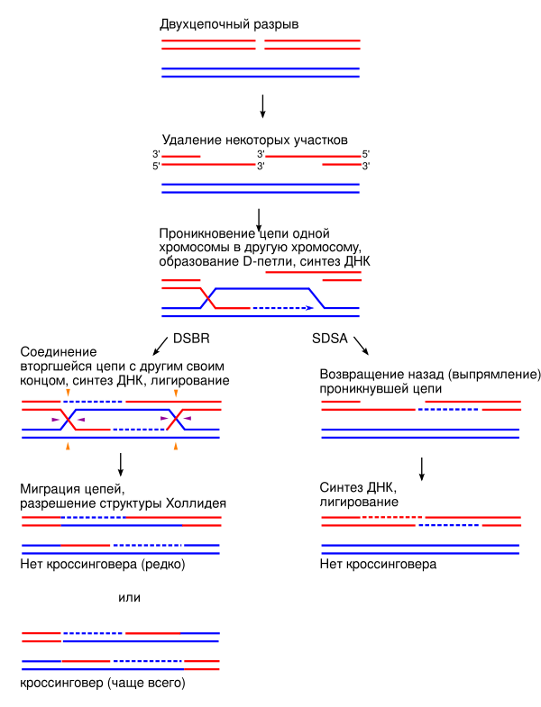 После отрезания, внедрения нити в соседнюю хромосому и синтеза ДНК ДНК-полимеразой различия между путями репарации двуцепочечных разрывов (DSBR-путь) и синтез-зависимого отжига цепей (SDSA-путь) становятся более отчётливыми[33]. DSBR-путь уникален тем, что на втором выступающем 3'-конце (который не участвовал во внедрении) также образуется структура Холлидея с цепью гомологичной хромосомы. Далее двойная структура Холлидея становится продуктом рекомбинации под действием никирующих эндонуклеаз — рестриктаз, вносящих разрыв только в одну цепь ДНК. DSBR, как правило, влечёт за собой кроссинговер, хотя иногда конечный продукт может быть другим (не претерпевшим кроссинговер). С использованием плазмид и эндонуклеаз на примере митоза почкующихся дрожжей была показана способность повреждённой нуклеотидной цепи принимать последовательности нуклеотидов у других молекул ДНК[35][36]. Из-за тенденции к кроссинговеру DSBR-путь, вероятно, можно рассматривать как модель кроссинговера, происходящего во время мейоза[21].