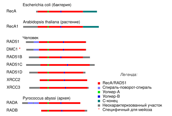 Семейство белков рекомбиназы RecA обнаруживается почти во всех организмах: RecA у бактерий, Rad51 и DMC1 у эукариот, RadA у архей и UvsX у фага T4[91]. Во всех трех доменах прослеживаются родственные белки, связывающие одноцепочечную ДНК, которые играют роль в рекомбинации и многих других процессах[92]; Rad54, Mre11, Rad50 и ряд других белков также найдены у архей и эукариот[90][91][93].