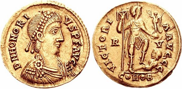 Фла́вий Гоно́рий А́вгуст (лат. Flavius Honorius Augustus; 9 сентября 384—15 августа 423) — первый император Западной Римской империи после окончательного разделения единой Римской империи на западную и восточную в 395 году. Сын императора Феодосия I[4]. Его правление — 395—423 годы — период торжества варваров, усиливающегося распада Западной Римской империи. При нём вестготы в 410 году захватили и разграбили Рим в Италии (Лации), так или иначе поддерживая превращение Восточно-Римской империи со столицей в Константинополе, (где в тот момент правил император Феодосий II Младший, родной племянник Гонория и одновременно по матери потомок франкской родоплеменной знати) в единственного правопреемника Римской империи.