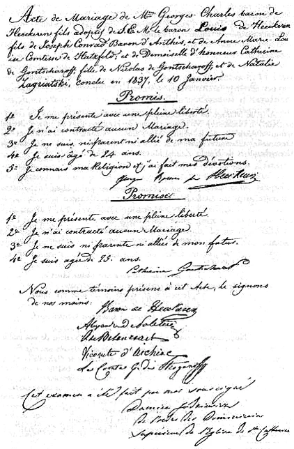 Пушкинист Яшин высказал предположение[27], что Дантес женился на Гончаровой, подчиняясь приказу Николая I. Публикация в Париже записок дочери императора Ольги Николаевны в 60-х годах XX века казалось бы подтвердила эту гипотезу. В их русском переводе значится: «…а Дантесу было приказано жениться на старшей сестре Наталии Пушкиной, довольно заурядной особе». Однако оказалось, что эта фраза была переведена ошибочно[K 5]. В подлиннике записок Ольги Николаевны сообщается о том, что друзья Пушкина нашли только один способ избежать дуэли: женитьбу Дантеса на Екатерине[28]. Тем не менее довольно быстро было получено императорское разрешение на брак католика и православной. Николай I не стал настаивать на принятии присяги на русское подданство Дантесом перед свадьбой, но жених обязывался «не отвлекать будущей жены от православной греко-российской веры»[29]. Екатерина Николаевна согласилась на то, чтобы дети, рождённые в этом браке, стали католиками[30].