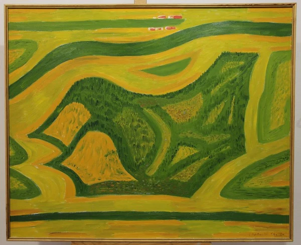 На картине представлено топографическое изображение ландшафта, выполненное на жёлто-зелёном фоне. В центральной части полотна тёмно-зелёным цветом контурно обозначены два холма, что составляет основу композиции. По периметру проходят зелёные полосы, подчёркивающие структуру изображения. Преобладают оттенки жёлтого и зелёного, формирующие характерную цветовую гамму работы.