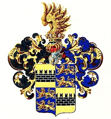 Щит поделён на четыре части. В первой и четвёртой золотых частях чёрная с серебряными швами крепостная стена. Во второй и третьей голубых частях по два, один под другим, золотых льва с красными глазами и языками. Над щитом дворянский коронованный шлем. Нашлемник: золотые орлиные крылья в полёте. Намёт: справа чёрный с золотом, слева голубой с золотом[2].