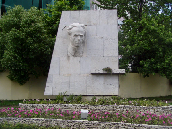 Стела с горельефом открыта 29 сентября 1964 года к 60-летию со дня рождения писателя. Авторы: скульптор — И. Д. Беккерман, архитектор — Е. А. Сердюков[2]. В советское время у памятника стоял почётный караул из двух пионеров и комсомольцев-корчагинцев.