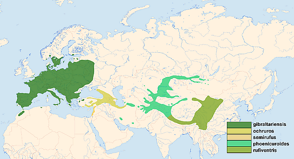 - Группа gibraltariensis объединяет европейские и африканские популяции, сформировавшие подвиды в течение последнего ледникового периода. Самки и молодые птицы отличаются тёмным окрасом.