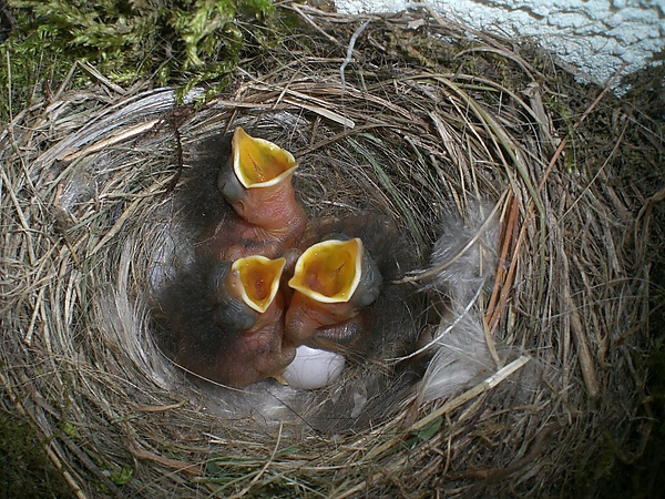 Птенцы появляются на свет в промежутке нескольких часов. Выкармливают и ухаживают за потомством оба родителя, хотя самки приносят корм более часто и регулярно, чем самцы, зато последние добывают большее количество пищи за один раз. За первые десять дней вес птенцов увеличивается более чем в 10 раз, примерно в 11-дневном возрасте появляется перьевой покров. Молодые встают на крыло через 12 — 19 дней, однако ещё в течение 15—17 суток ночуют в гнезде, после чего рассеиваются.[30]