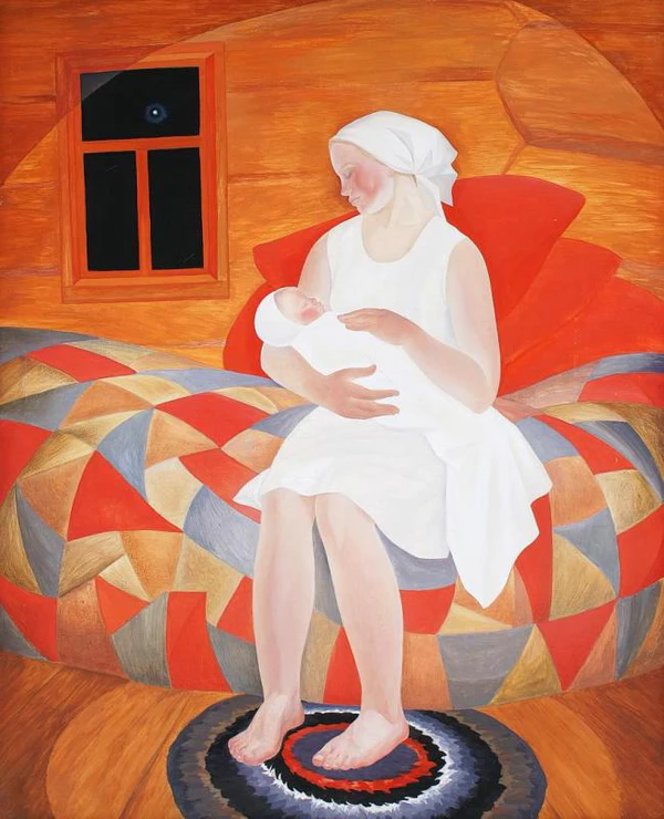 В интерьере бревенчатой комнаты изображена кровать, покрытая лоскутным одеялом, на которой в правой части возвышаются три подушки. В центре композиции сидит молодая мать с ребёнком на руках: её тело развёрнуто в три четверти влево, а голова в профиль, наклонена к ребёнку. Женщина одета в белое платье и косынку, её босые ноги стоят на круглом цветном коврике. Над кроватью расположено окно, в котором видна одинокая звезда. На стене и полу заметны овалы света от лампы. Работа выполнена гладкой живописью с использованием преобладания красных, белых, коричневых, голубовато-серых и чёрных оттенков в цветовой гамме.