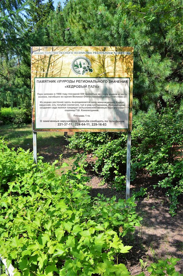 «Парк заложен в 1988 году посадкой 500 привитых на сосну кедров в честь воинов, погибших в Великую Отечественную войну 1941—1945 гг.