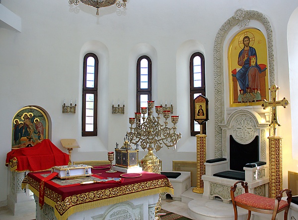 Центральная часть восточной стены алтаря располагалась в полукруглой нише апсиды, которую обрамляли седалища для епископов и священников: при этом задние ряды возвышались над передними — как в амфитеатре. На самом верху водружалась кафедра (трон) для патриарха (Горний престол), а ниже, по его сторонам, устраивался синтрон — скамьи или сидения для священников. Известно, что Иоанна Златоуста критиковали, среди прочего, за то, что он во время своих знаменитых проповедей находился не как обычно на Горнем месте (куда из-за болезней ему было тяжело взбираться), а на амвоне, находящемся почти посреди храма (это было возвышенное место чтеца), откуда он вещал продолжительное время, не напрягая свой уже слабеющий голос[1].