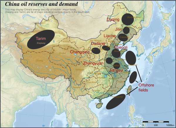 Крупнейшим месторождением нефти в Китае является Дацин на северо-востоке страны. Крупные месторождения имеются на северо-западе (Таримский нефтегазоносный бассейн, Карамай), а также в провинциях Сычуань, Шаньдун, Ляонин (Ляохэ) и Хэнань. Сланцевая нефть имеется в провинциях Ляонин и Фушунь. Морская нефтедобыча ведётся в Бохайском заливе (Бочжун, Кэньли, Луда) и других прилегающих акваториях (месторождения Вэйчжоу, Вэньчан, Луфэн). Несмотря на довольно высокий уровень добычи нефти КНР является одним из крупнейших её импортёров.