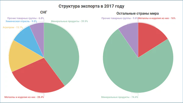 Доля полезных ископаемых в экспорте Казахстана увеличилась. В 2017 году минеральные продукты составляли 68,6 % казахстанского экспорта (увеличение на 3,6 % по сравнению с предыдущим годом). Общий объём продаж минеральных продуктов вырос за год (2016—2017) примерно на 9,3 млрд долларов.[10]