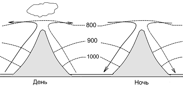 Днём склон прогревается, образовавшийся слой теплого воздуха поднимается вверх, образуется восходящий анабатический ветер.
