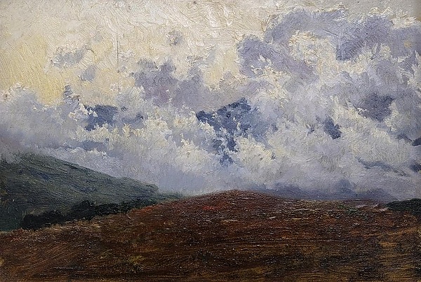 Полотно представляет собой пейзаж, в композиции которого на первом плане изображена невысокая коричневая гора. На втором плане слева располагается гора, покрытая зелёными деревьями, а справа — зелёный склон другой горы. Верхнюю часть картины занимает небо с серебристо-серыми облаками различной формы.