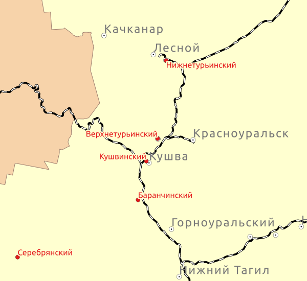 В 1877 году позитивное влияние на деятельность Гороблагодатских заводов оказал запуск в эксплуатацию Уральской горнозаводской железной дороги. Кушвинский и Баранчинский заводы оказались вблизи станций Кушва и Баранчинская соответственно[49][48].