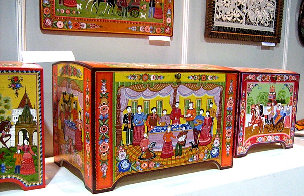 В нижегородских росписях можно различить два типа — павловские и городецкие росписи, которыми украшали сундуки, дуги, сани, детскую мебель, донца для прялок и многие мелкие предметы обихода. Городецкий стиль отличается прежде всего содержательностью. В росписях основное впечатление дают жанровые сцены. Все эти изображения условны по характеру, очень вольны и декоративны по форме, а иногда граничат с шаржем. Это — быт крестьянства, купечества, пышный парад костюмов. Значительное место занимают цветочные мотивы — пышные «розаны», писанные широко и декоративно. По выражению А. В. Бакушинского мастер стал подлинным живописцем. Об этом же говорит и В. С. Воронов, писавший, что «нижегородская манера представляет нам наиболее чистый вариант подлинного живописного искусства, преодолевшего рамки графического пленения и основанного исключительно на элементах живописи…» Рядом с жанровыми реалистическими мотивами в городецких росписях живут и идеализированные, декоративные образы птиц и животных.
