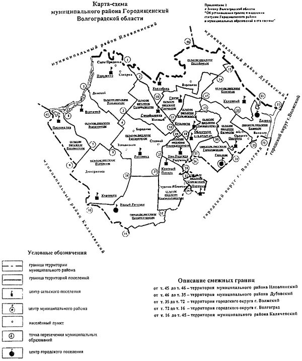 Границы Городищенского района установлены Законом Волгоградской области от 14 мая 2005 года «Об установлении границ и наделении статусом Городищенского района и муниципальных образований в его составе» № 1058-ОД[6].