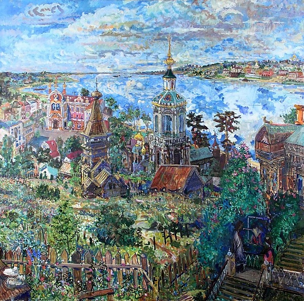 На полотне представлен волжский пейзаж, выполненный в условно-реалистической манере с использованием перспективы с высоты птичьего полёта. Композиция строится с высокой линией горизонта, что позволяет охватить широкий вид на окрестности Волги. В левом нижнем углу изображены две кошки, а вдоль плоскости картины тянется длинный забор. В правой части работы расположена лестница, ведущая к дому с зелёной крышей, украшенной деревянной резьбой и фигуркой птицы на коньке. На лестничной площадке изображены две фигуры — человек в длиннополой серой одежде и женщина в лиловом. Слева пространство занимает сад, а центр полотна отмечен двухъярусной колокольней с фонариком и шпилем в форме «раковины». Левее расположена деревянная шатровая церковь с луковичной главкой, а ещё дальше — городской квартал, в котором выделяется трёхэтажное здание в неорусском стиле с пёстрым фасадом и массивным боковым ризалитом. На дальнем плане изображён песчаный берег и холмистая местность, а русло реки тянется слева направо. В правом верхнем углу виден противоположный холмистый берег с застройкой, напоминающей Рыбинск. Живопись отличается однослойностью и открытой фактурой.