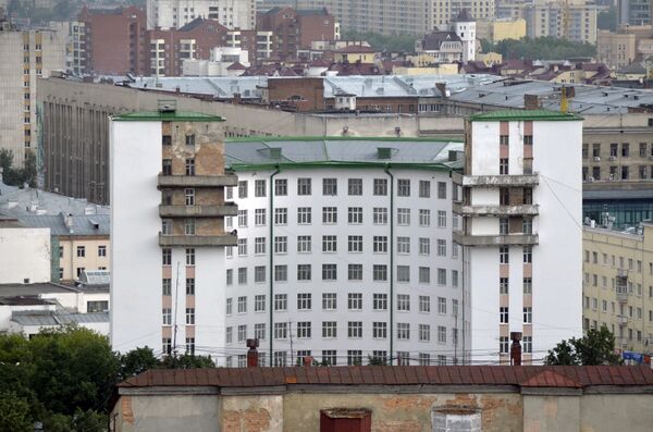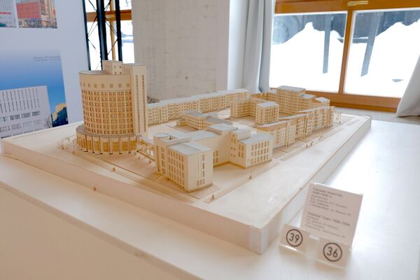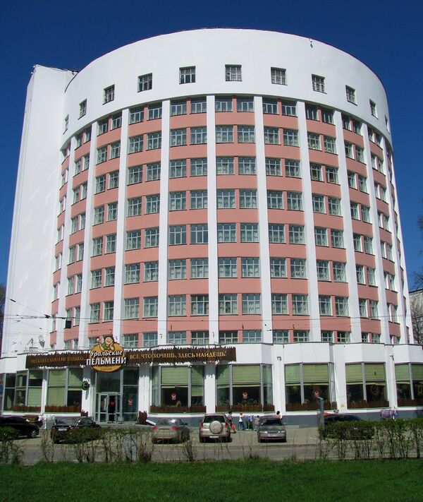 Самое большое здание необычной полукруглой формы, проектировалось как «общежитие для одиноких, малосемейных и командированных». Оно стало первым капитальным зданием в этом районе. Впоследствии было перепрофилировано в гостиницу «Исеть», ставшую одним из символов Екатеринбурга.