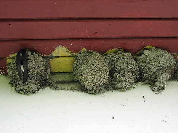Гнездо представляет собой закрытую полусферу из комочков земли, приклеенную к стене и потолку клейкой слюной. Диаметр гнезда 110—130 мм, высота 70—120 мм[22]. В верхней части сферы делается небольшой вход в виде щели, а иногда к нему протянута небольшая трубка. Изнутри гнездо выстилается травой, шерстью и другим мягким материалом, который птица подхватывает на лету. Самец и самка поочерёдно занимаются оборудованием гнезда, принося в клюве сырые комки грязи и формируя из них шаровидную стенку. Иногда прибывшие на место самки начинают строительство самостоятельно, не дожидаясь самцов[11]. Возле незаконченного гнезда постоянно кто-то дежурит, в то время как другая птица добывает строительный материал. В случае отсутствия хозяев гнездо охотно занимают воробьи, и тогда ласточкам приходится отстраивать его заново на новом месте. У готового гнезда размер входа достаточен для того, чтобы в него мог пролезть воробей[10][23]. В процессе работы делаются продолжительные перерывы, которые в случае ненастной погоды могут занять несколько дней — они необходимы, чтобы земля подсохла и не обвалилась под собственной тяжестью. Всё строительство занимает до 12—14 дней[7].