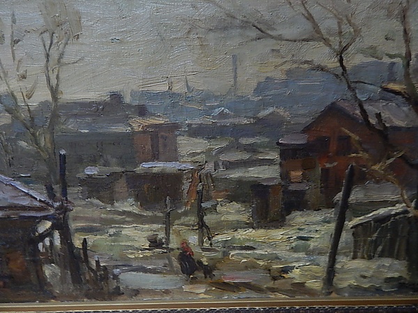 На полотне представлен индустриальный пейзаж, изображающий зимнюю городскую окраину. На первом плане расположен двор среди низких дощатых домов, слегка покрытых снегом. В центральной части двора выделяются два столба, рядом с которыми различимы силуэты женщины в красном платке и, предположительно, ребёнка. На заднем плане справа виднеются контуры высоких заводских строений и труб, подчёркивающие промышленный характер местности. Композиция построена с использованием нескольких планов, что усиливает ощущение пространства и глубины.