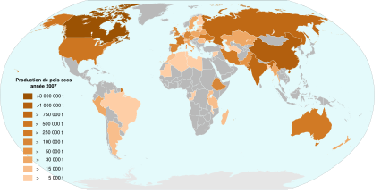 В 2016 году суммарное мировое производство сушёного гороха составило 14,36 миллионов тонн. Крупнейшими производителями гороха в мире являются Канада, Россия и Китай (в сумме 56 % мирового производства). С 2010 года (10,3 миллионов тонн) производство выросло почти в полтора раза.