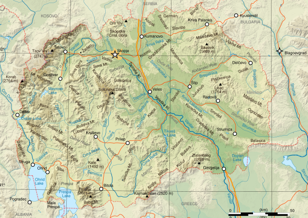 Северная Македония — преимущественно горная страна. Средняя высота местности составляет 832 метра[1]. Примерно 80 % территории страны состоит из холмов и гор. Горы делятся на две основные группы: с одной стороны, на северо-западе — горный хребет Шар, который продолжается до горного хребта Западный Вардар / Пелагония на юго-западе и юге (граничит с хребтами Динар). С другой стороны, на юго-востоке — горная цепь Осогово-Беласица (самый западный участок гор Рила-Родопы).