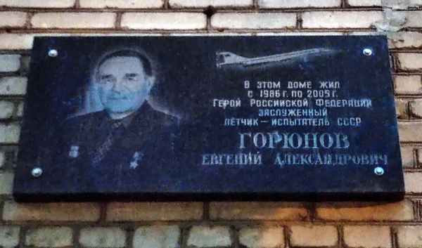 - На доме в г. Жуковском по ул. Гагарина, где жил Е. А. Горюнов, установлена мемориальная доска