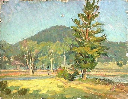 На полотне представлен пейзаж с протекающей рекой, берега которой покрыты тёплой зеленью на переднем плане. Справа возвышается высокое дерево, за которым открывается вид на реку и песчаный берег. На этом берегу, слева, изображены три дерева. На горизонте возвышается зелёно-голубая гора, а над ней раскинулось яркое голубое небо. Композиция отличается солнечностью и яркостью цветовой гаммы.