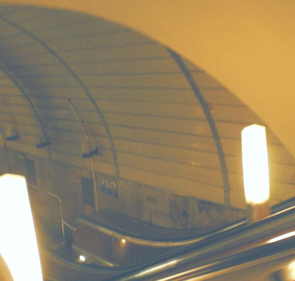 Потолок вестибюля отделан жёлтыми металлическими листами.