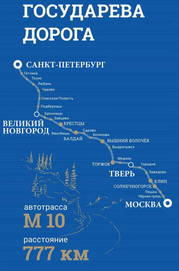 Большая часть 777-километрового маршрута проходит по федеральной трассе М-10. В него вошли достопримечательности Тверской, Московской, Ленинградской и Новгородской областей. Шестидневное путешествие включает 30 экскурсий, проживание в классифицированных гостиницах, прогулки по историческим местам и возможность приобрести уникальные сувениры, созданные местными мастерами[5].
