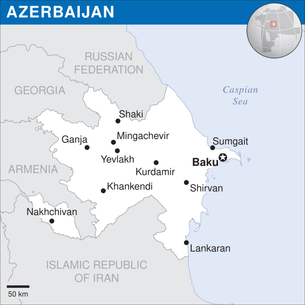 По суше территория Азербайджанской Республики граничит с 5 государствами. Общая протяжённость сухопутной границы составляет 2657,4 километра: 390,3 км с Российской Федерацией, 480 км с Грузией, 1007,1 км с Арменией, 15 км с Турцией, и 765 км с Ираном[3].