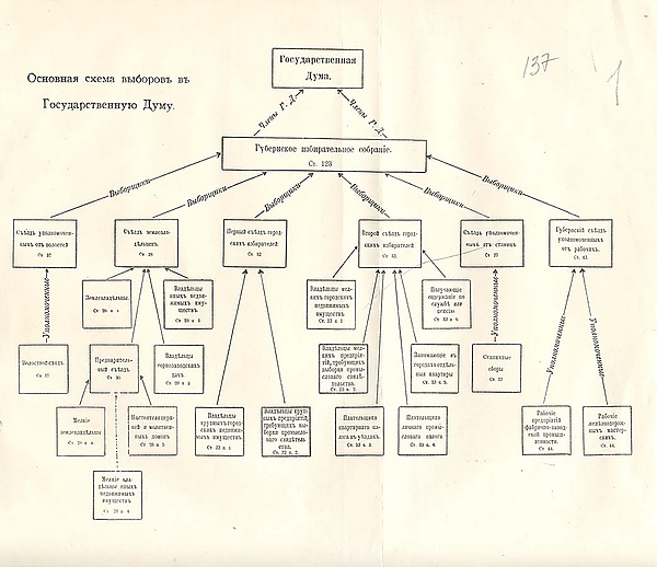 - для городской курии двухступенчатые: в Москве, Санкт-Петербурге и 24 крупных указанных в избирательном законе городах избиратели выбирали выборщиков на городское собрание, которое затем избирало членов Думы;